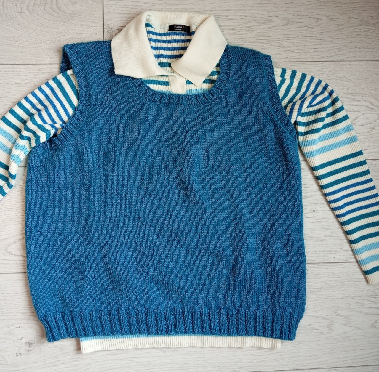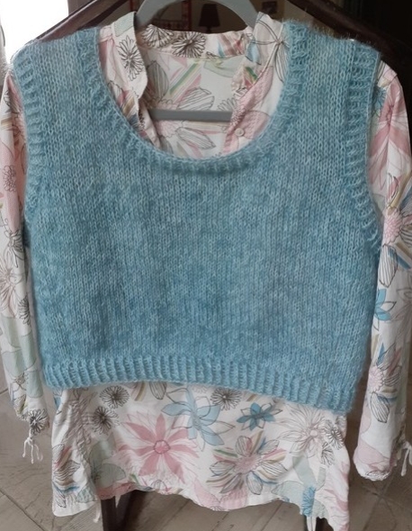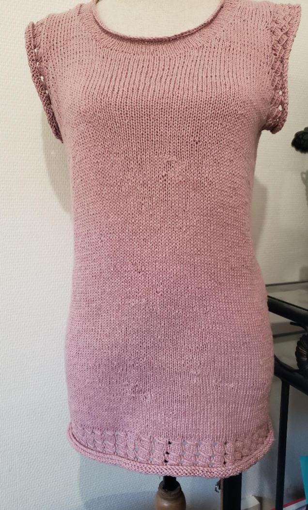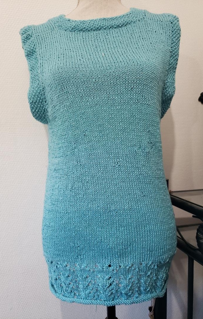 J'ai apprécié cette classe de pulls sans manche car dans ma garde-robe, il me manquait des tops d'été tricotés avec de la fibre végétale : le vieux rose est en coton et le bleu lagon en fibre de bambou.