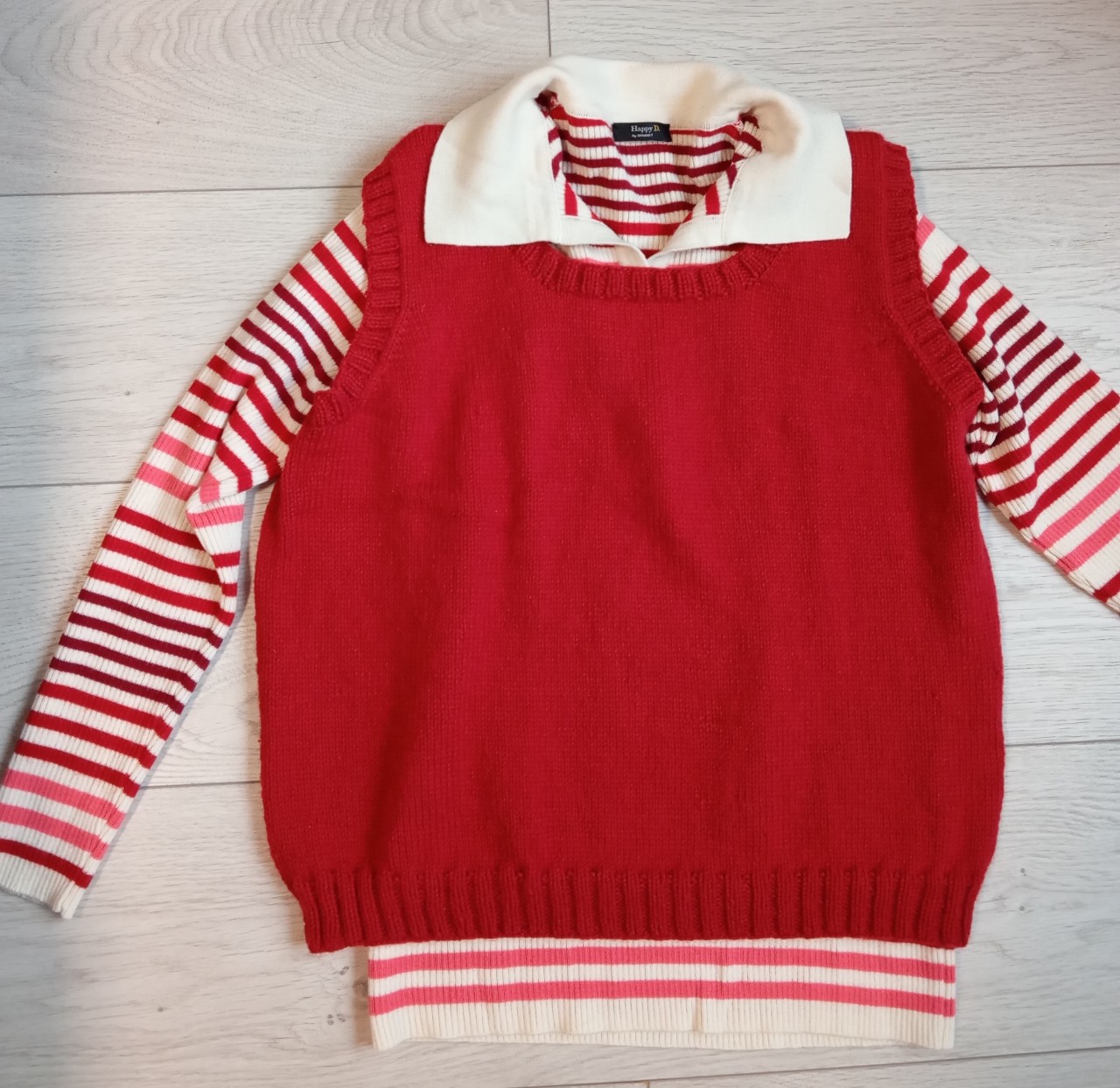Il est un peu large sur le haut, car je tricote un peu plus lâche en aller-retours et plus serré en rond.