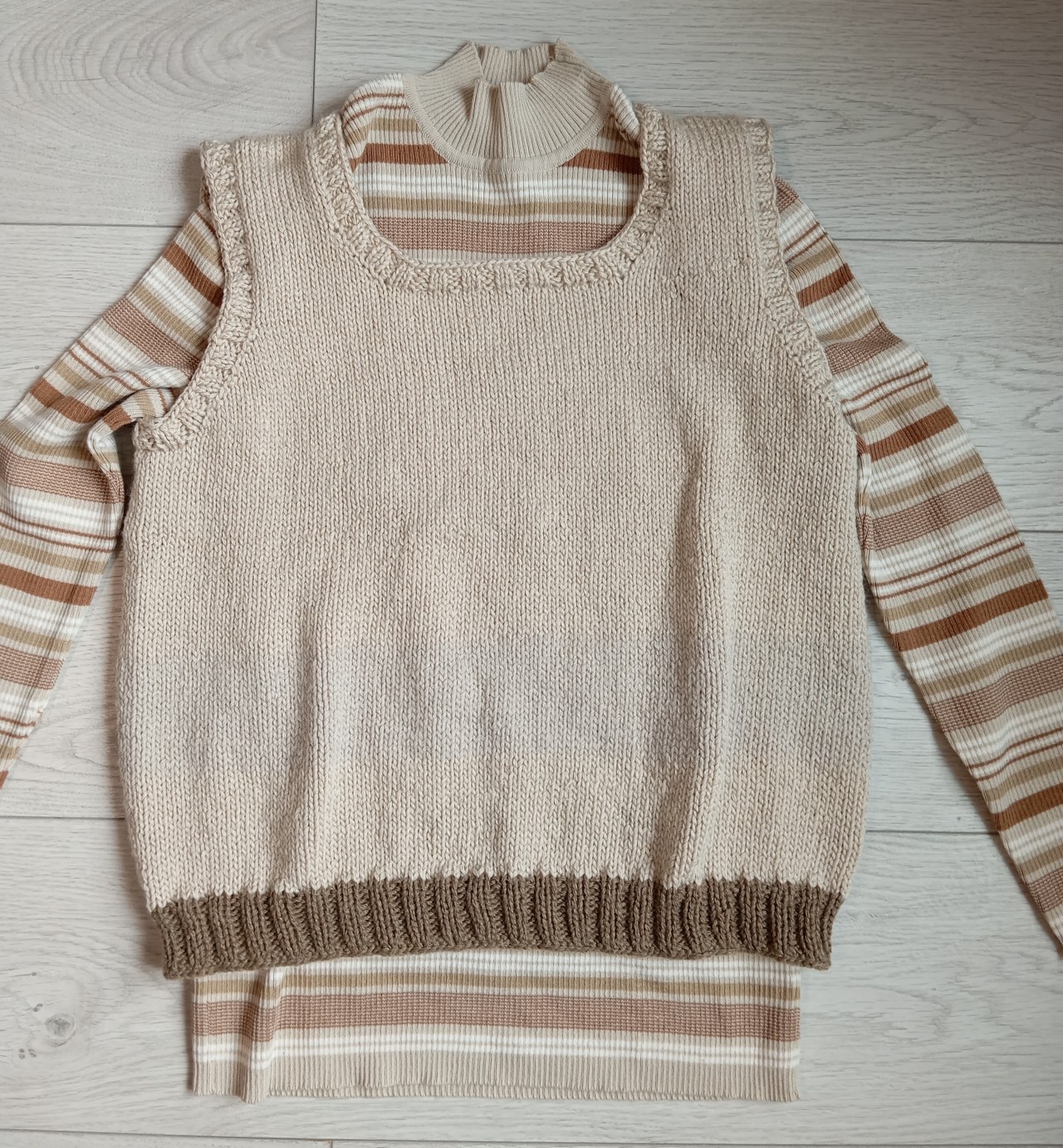 Et comme vous le voyez, j'ai remplacé les traditionnelles côtes pour les finitions du bas et des manches par des points fantaisie adaptables au tricot en rond afin d'apporter une touche élégante et féminine à mes tops d'été.